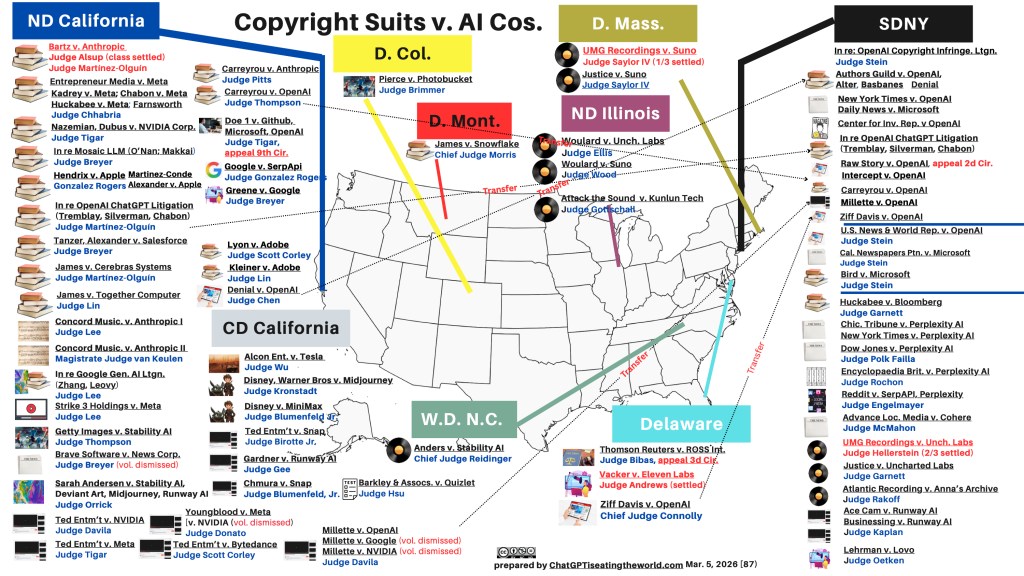 The cases against AI companies continue to grow. Two new cases were added to the Map of Copyright Suits: Some recent cases have now been assigned judges: DOWNLOAD THE MAP WITH LINKS TO EACH DOCKET