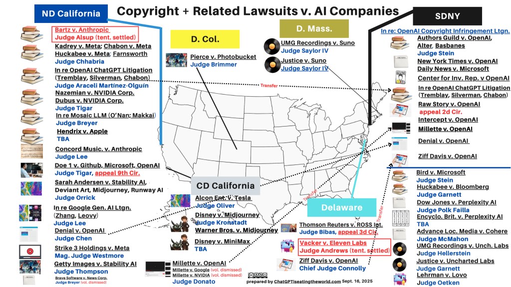 We updated the Map of US copyright lawsuits against AI companies, to include the recently filed Woulard v. Suno, a sister suit to Woulard v. Uncharted Labs in the Northern District of Illinois. The new total = 57 US copyright lawsuits.