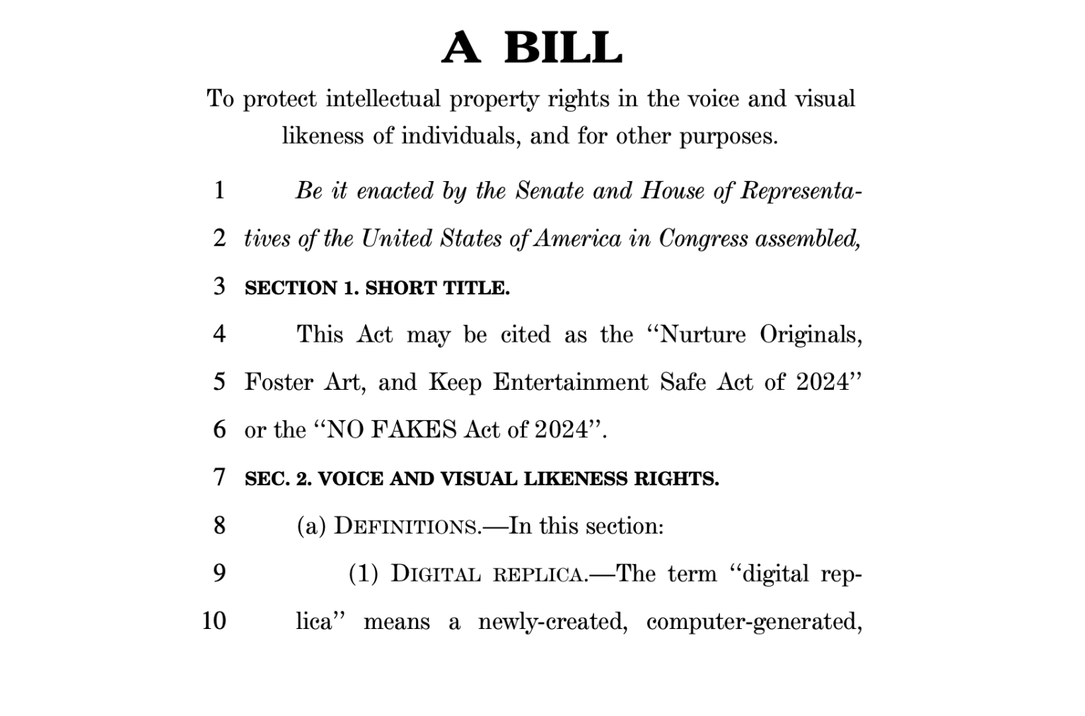 The Nurture Originals, Foster Art, and Keep Entertainment Safe Act of 2024, known as the NO FAKES Act, was introduced in Congress. The bill is intended “to protect the voice and visual likenesses of creators and individuals from the proliferation of digital replicas created without their consent.”