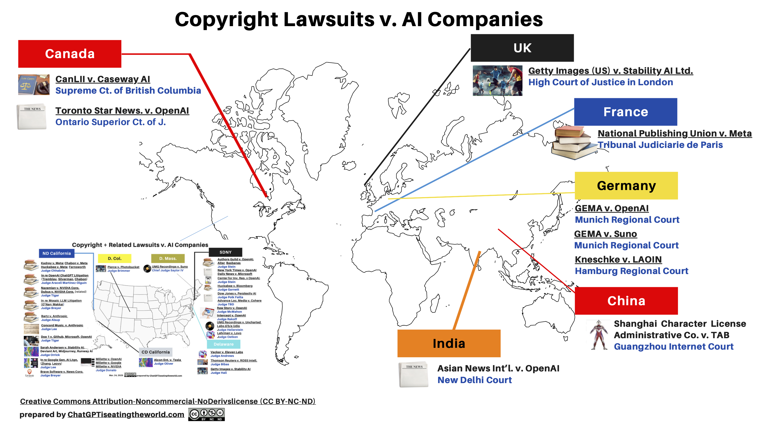 We created a second map, this time of a world map of all copyright lawsuits in the world. The United States is still the epicenter of copyright litigation against AI companies.