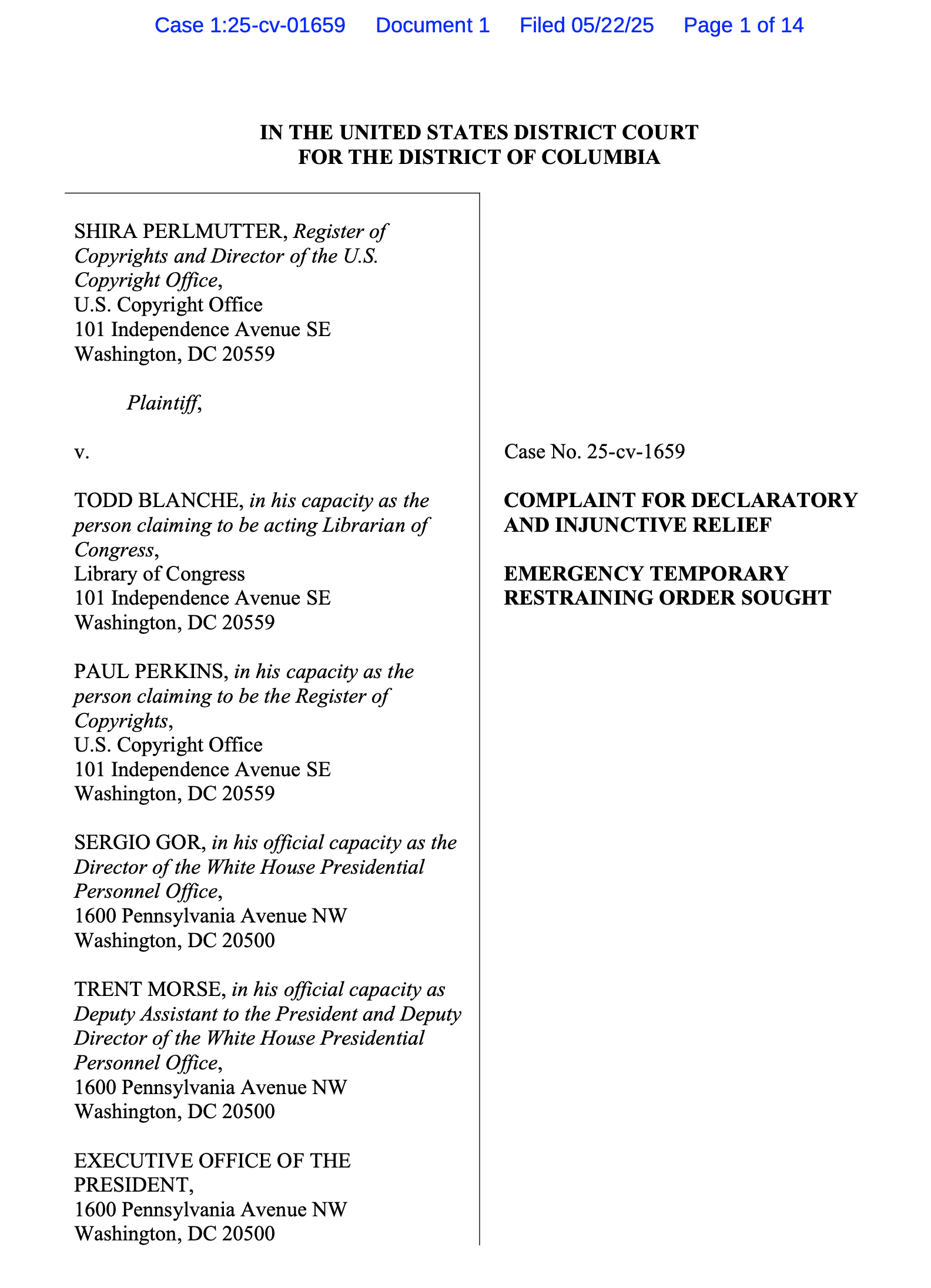 Shira Perlmutter has sued Todd Blanche, Donald Trump, Paul Perkins, and others for her termination as the Register of Copyrights. The PDF of the complaint is below, along with the memorandum in support of their motion for a temporary restraining order.