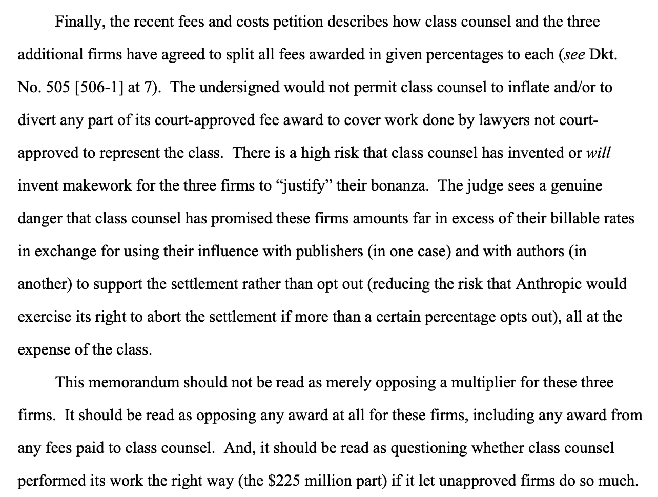 In one of his final orders before his retirement from the bench in a few days, Judge William Alsup issued a strong rebuke of the Bartz Class Counsel’s motion for attorneys’ fees beyond the 2 firms appointed class counsel, Susman Godfrey LLP and Lieff Cabraser Heimann & Bernstein LLP.
