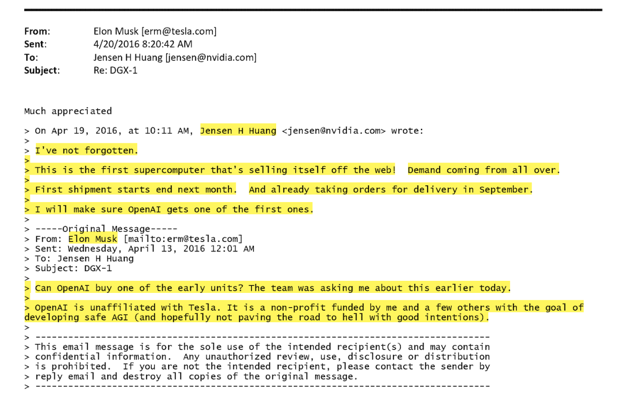 Back in 2016, Elon Musk emailed NVIDIA CEO Jensen Huang to acquire NVIDIA’s new DGX-1 AI supercomputer. Musk was funding and providing guidance to the OpenAI lab when it was a nonprofit.
